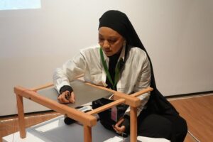 “Ada banyak sekali yang mau disampaikan bahwa dalam aktivitas menyulam ada dua teknik dasar. Saya juga belajar kepada seniman sulam senior khas Minangkabau, pola aslinya dipajak di dinding galeri.